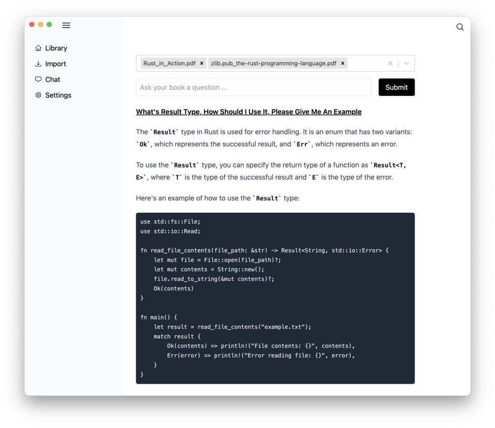 - Standalone macOS app to let you chat with your local books (pdf/epub)